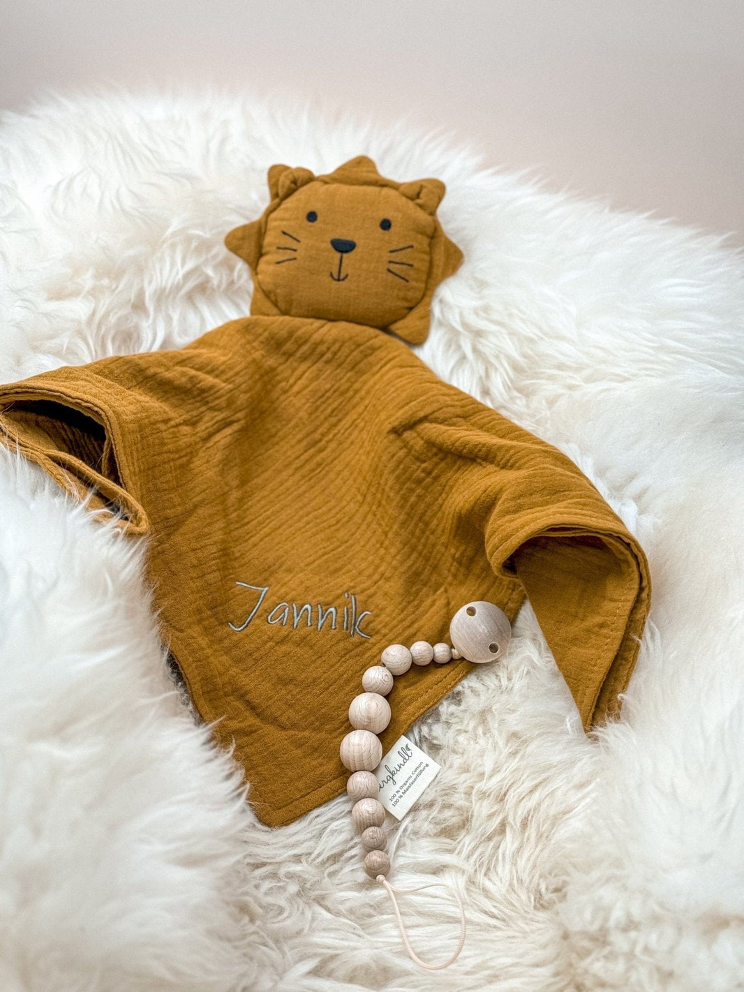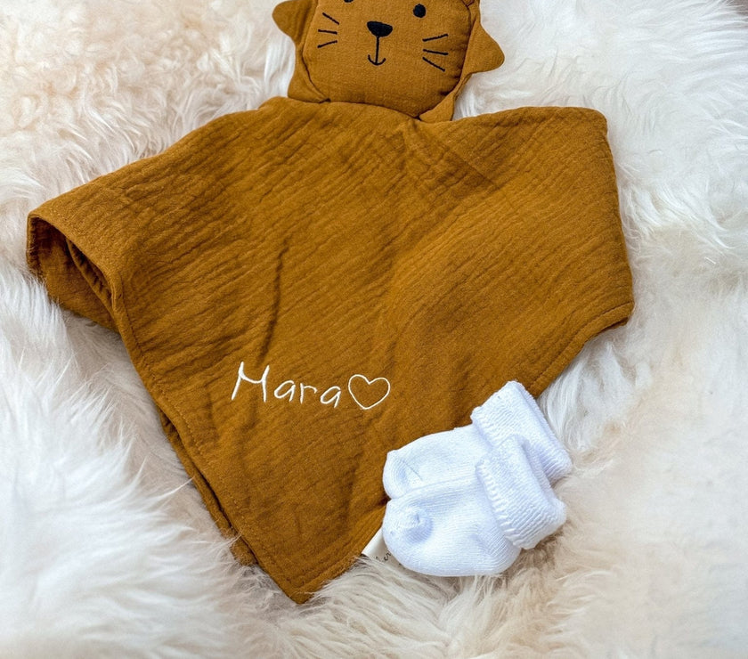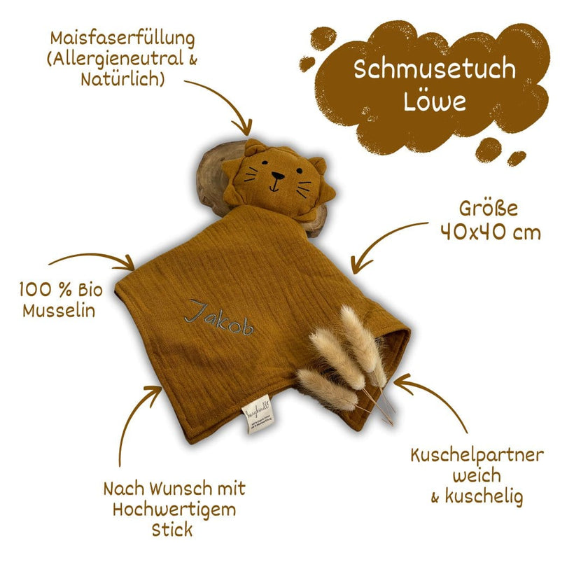 Das Schnuffeltuch Löwe in der Farbe Ocker ist der ideale Begleiter für Babys und Kleinkinder. Es bietet Geborgenheit und Trost. Dieses Schnuffeltuch ist nicht nur ein süßer Begleiter für dein Baby, sondern auch eine wunderbare Geschenkidee – ob zur Geburt, Taufe oder als Aufmerksamkeit für frischgebackene Eltern.